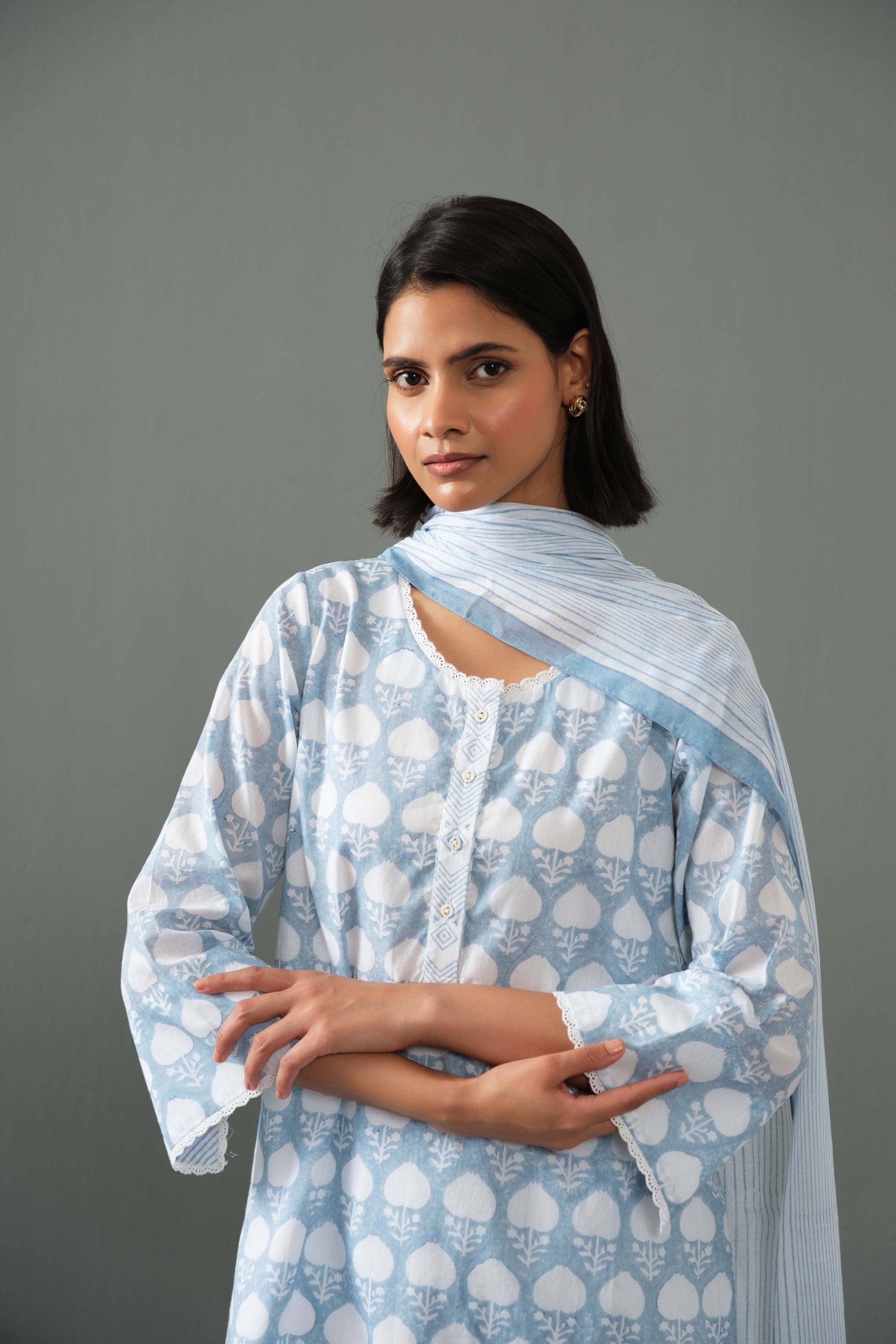 A beautiful block print kurta set with a front button opening, enhanced with elegant lace detailing on the neckline and sleeves for a graceful look.Paired with straight pant and cotton dupatta.