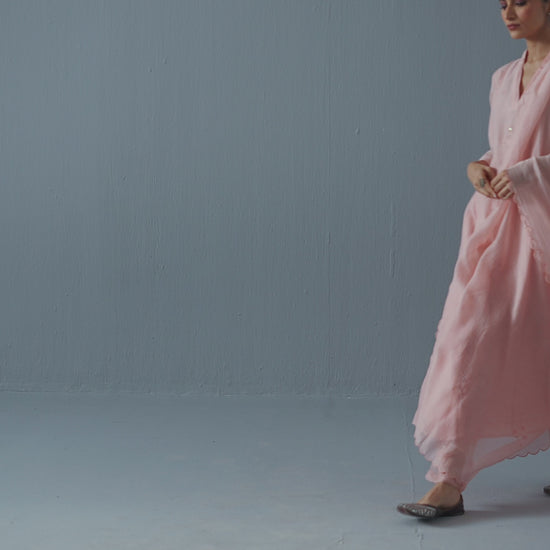 Crafted in elegant Chanderi fabric, this kurta features intricate embroidery and pin-tuck detailing at the neckline. It’s paired with organza-patched embroidered pants and a lightweight Chanderi dupatta, making it perfect for festive or semi-formal occasions.