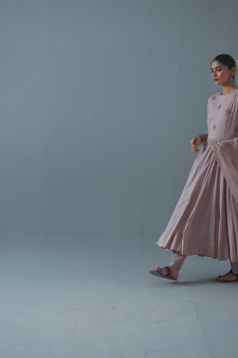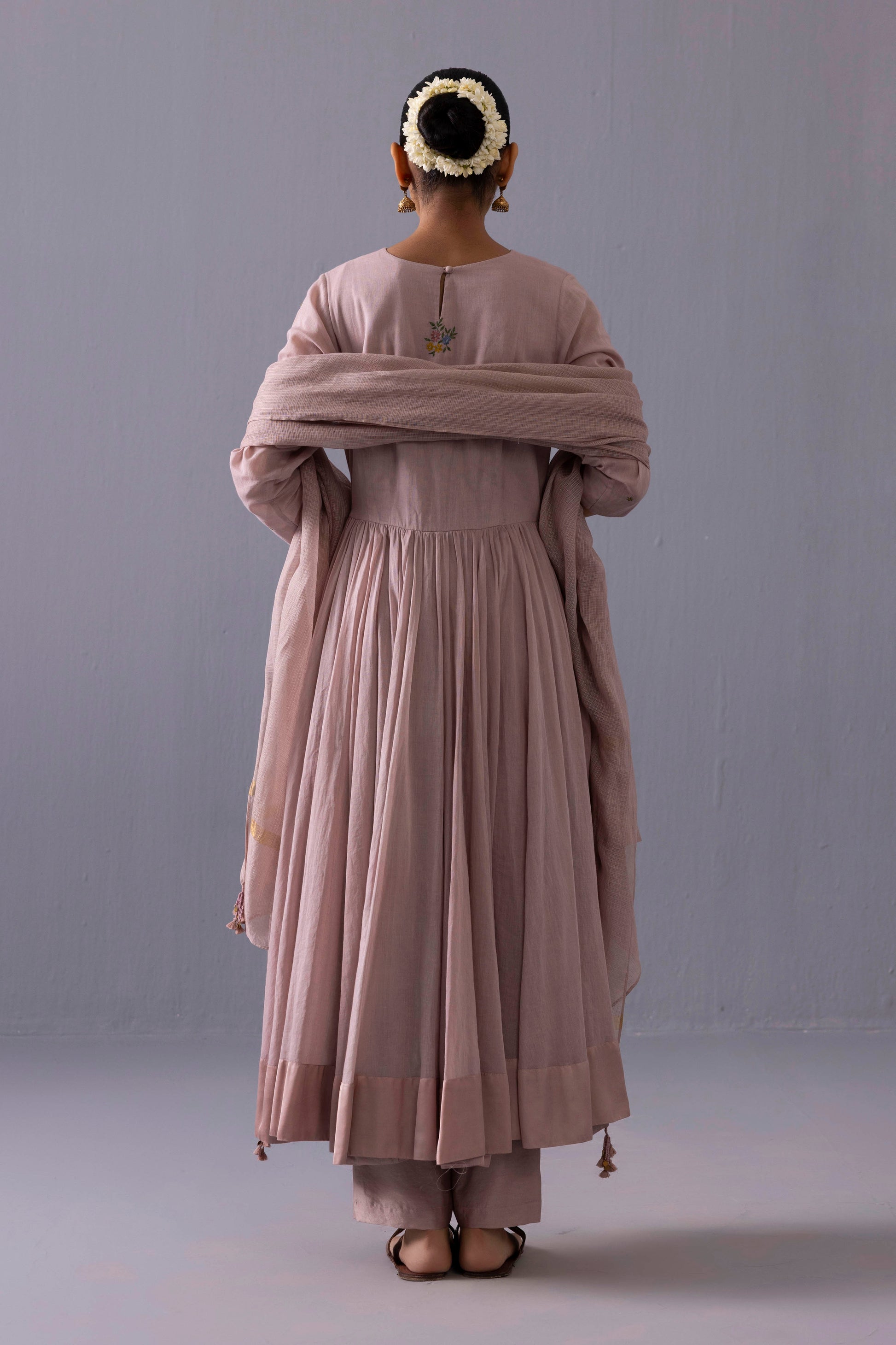 An Anarkali-style cotton kurta adorned with colorful embroidery, paired with a Chanderi pant for a graceful silhouette. Completed with a lightweight cotton Kota dupatta featuring delicate tassels for a charming finish.
