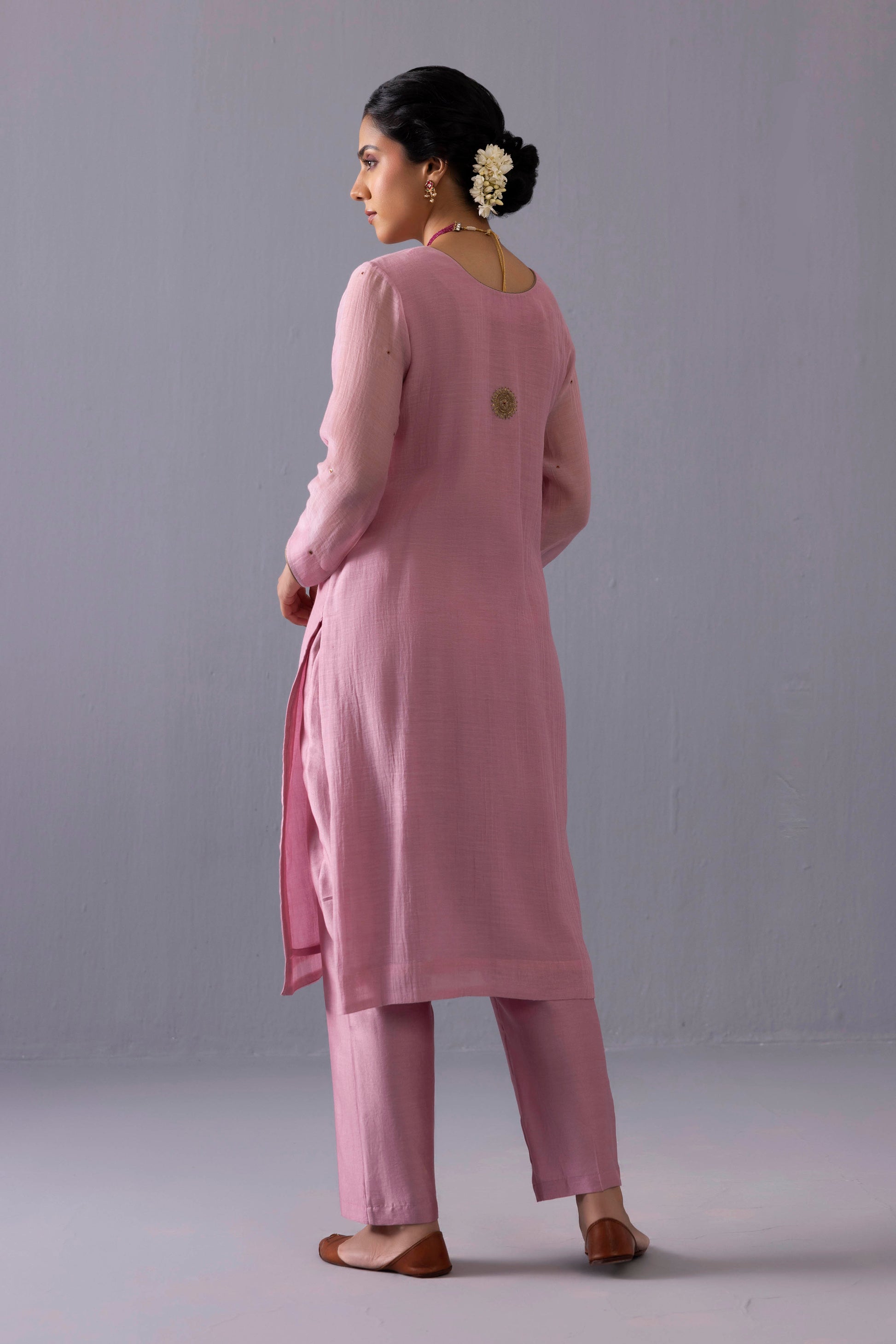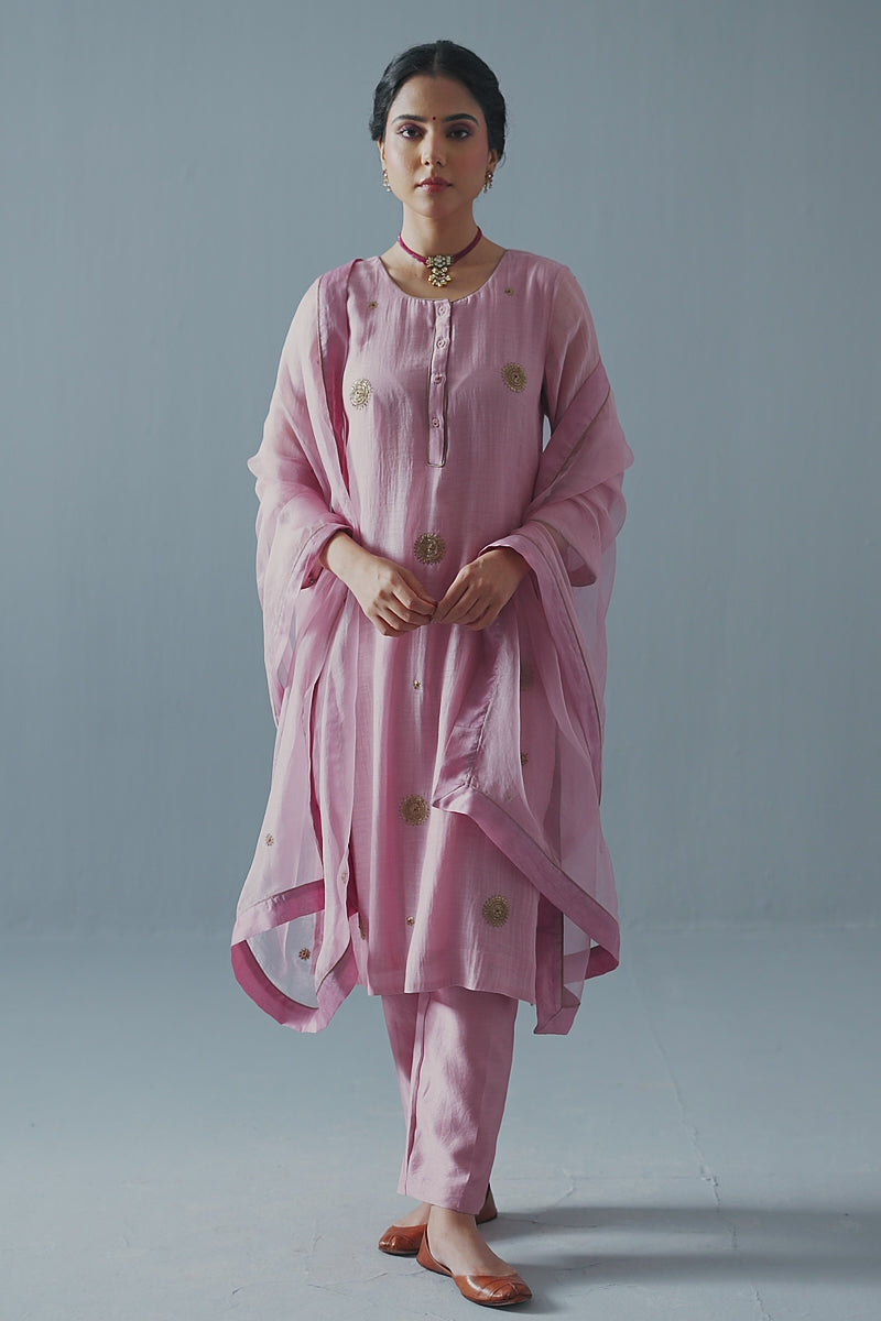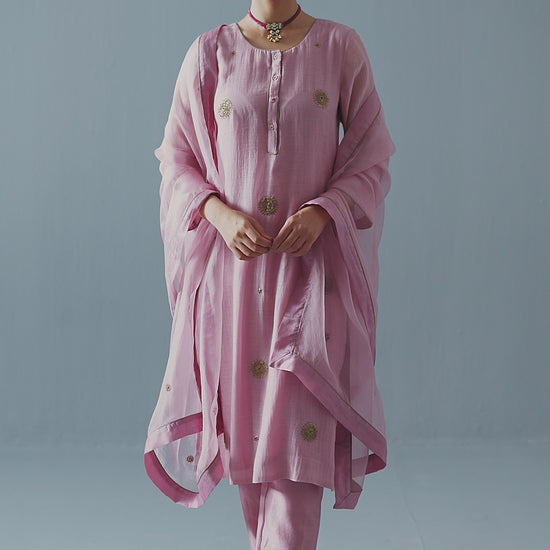 A refined straight-fit kurta and pant set featuring intricate hand embroidery. Paired with a matching hand-embroidered dupatta, finished with a detailed border on all sides—perfect for understated elegance.
