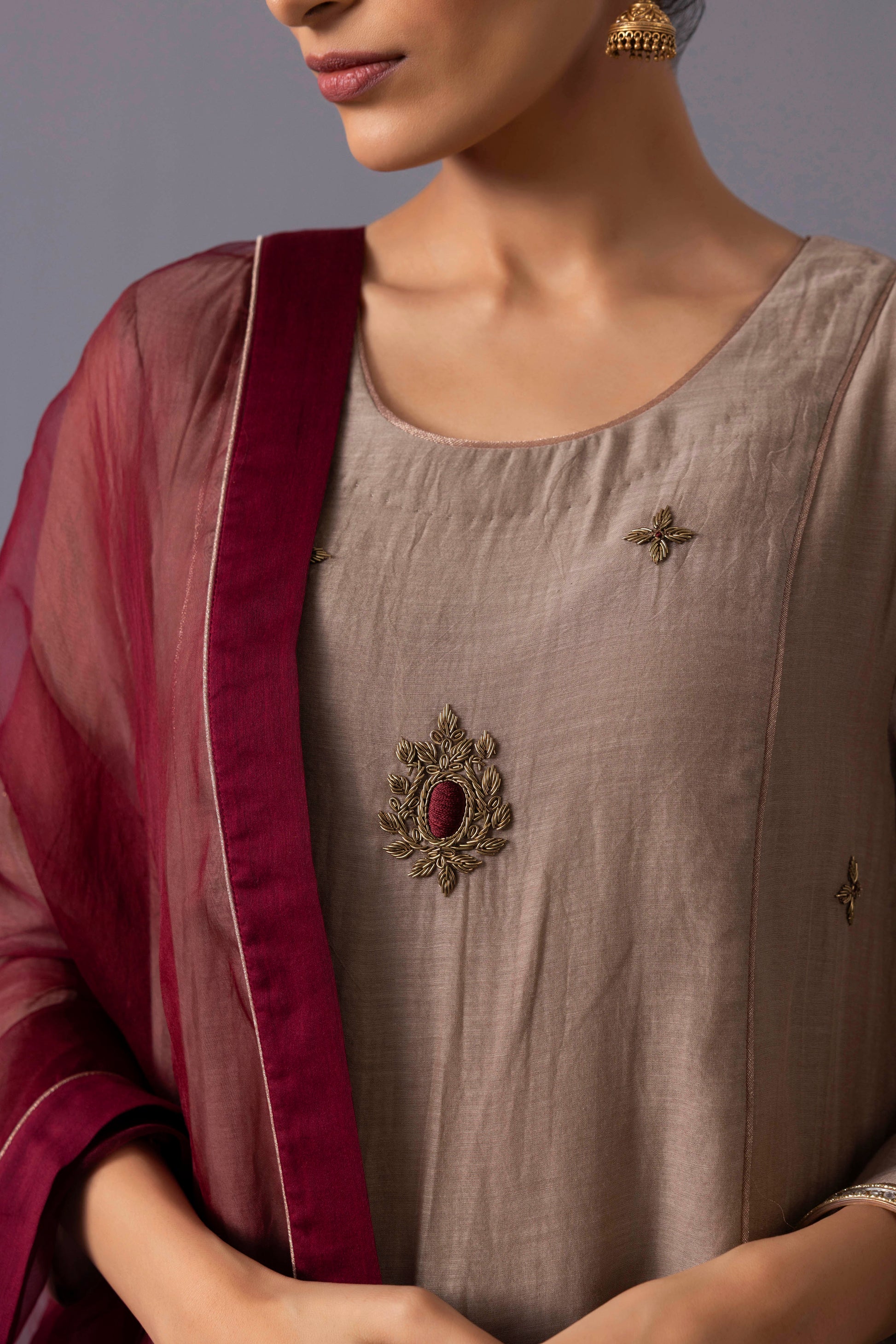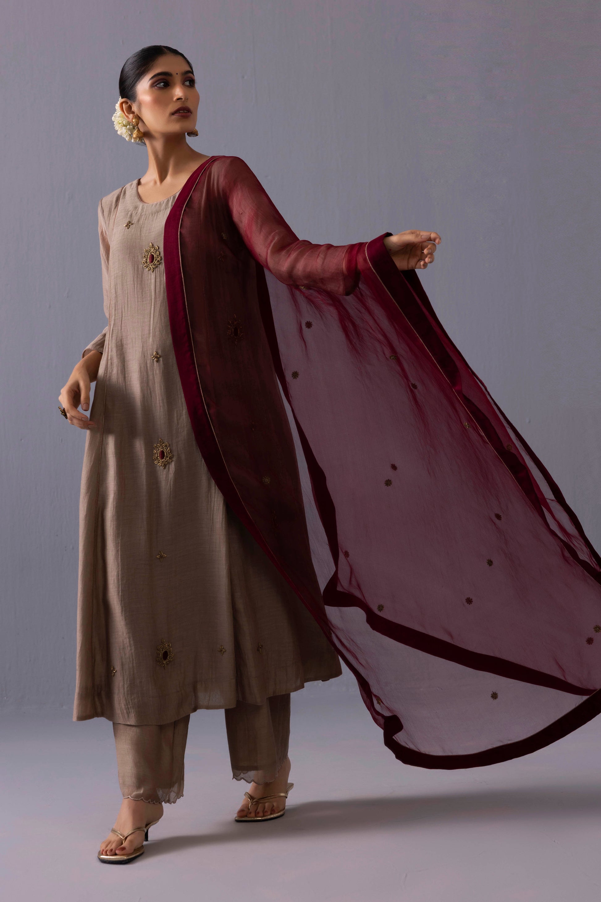 This elegant Chanderi panelled kurta features a classic round neckline and is paired with a flared palazzo showcasing scalloped detailing at the hem. Finished with a contrast organza dupatta for a refined, statement look.