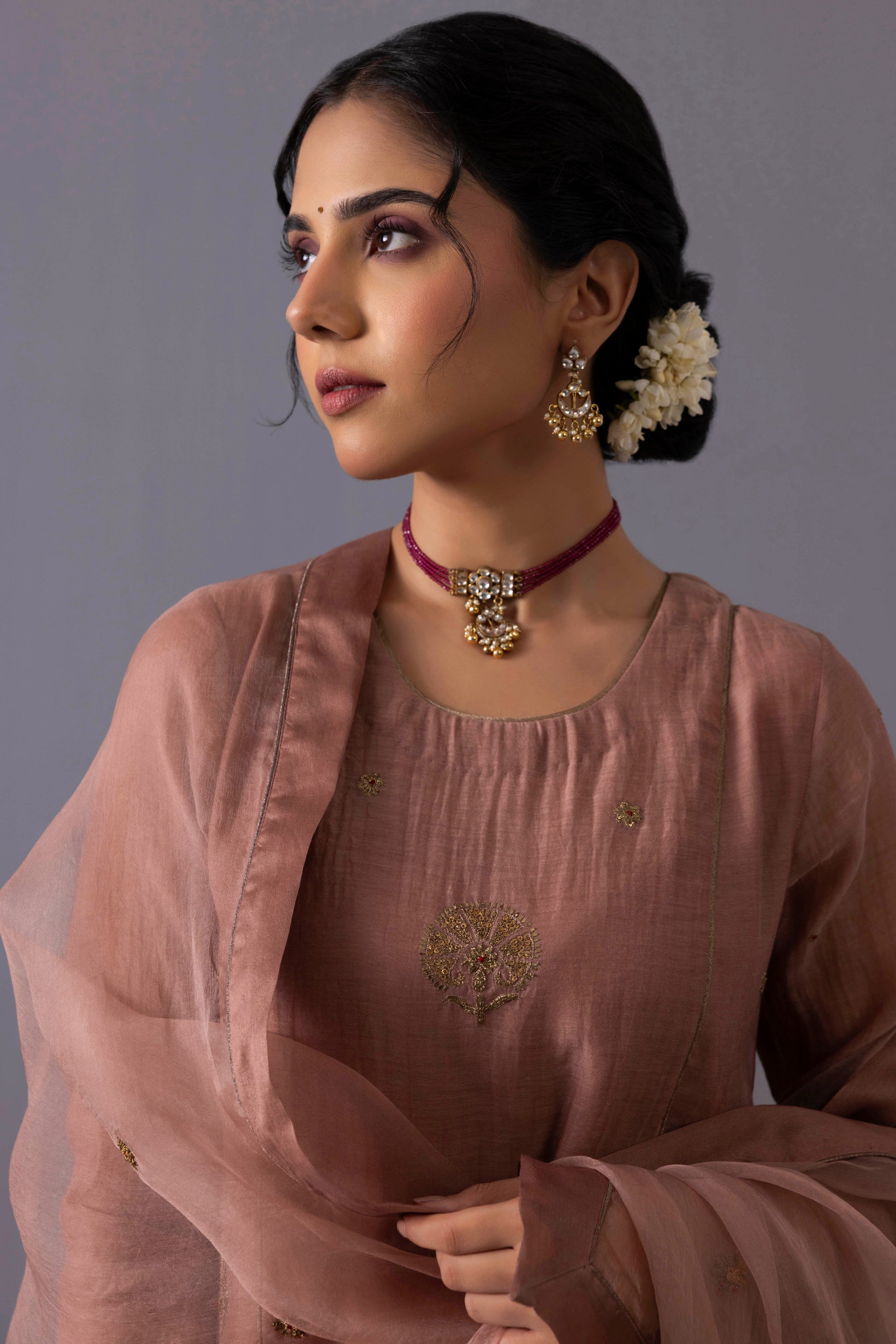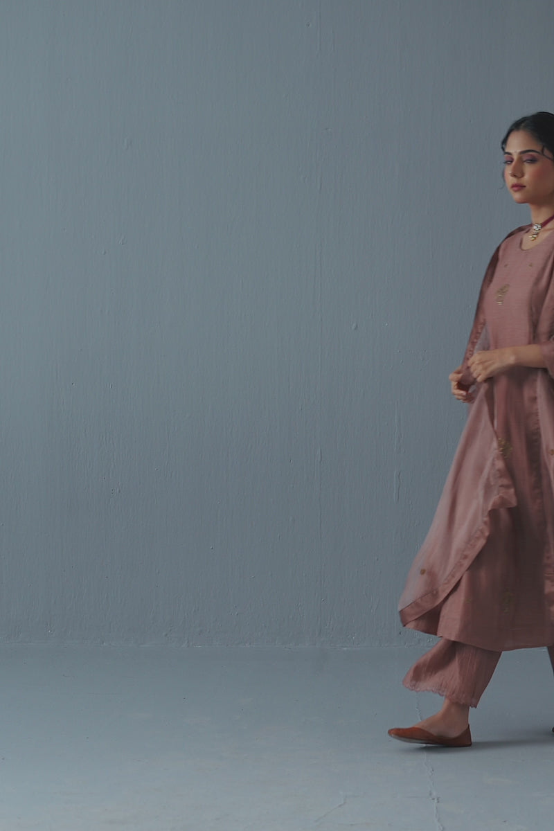 This elegant Chanderi panelled kurta features a classic round neckline and is paired with a flared palazzo showcasing scalloped detailing at the hem. Finished with a matching organza dupatta for a refined, statement look.