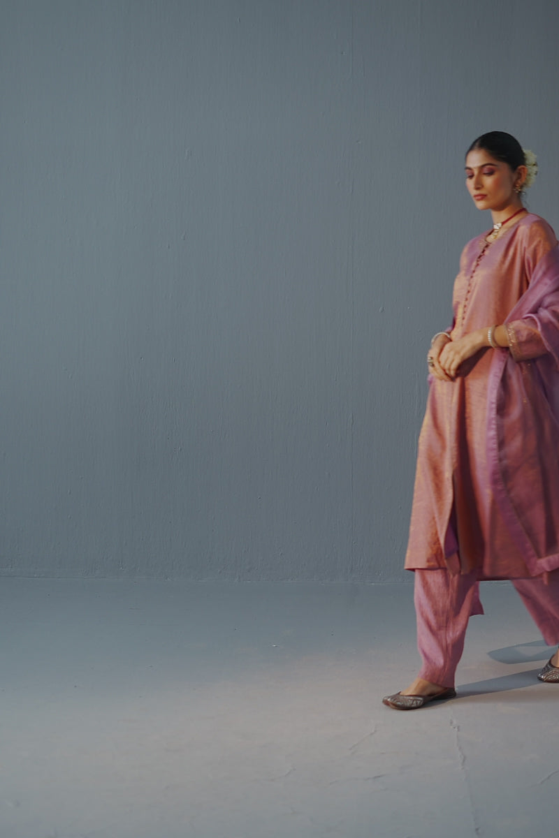 A graceful Tissue Chanderi kurta with a front opening, button detailing, and a front slit. Features delicate embroidery on the neckline, pocket, and sleeves. Paired with straight-fit pants and a lightweight organza dupatta for a complete, elegant look.