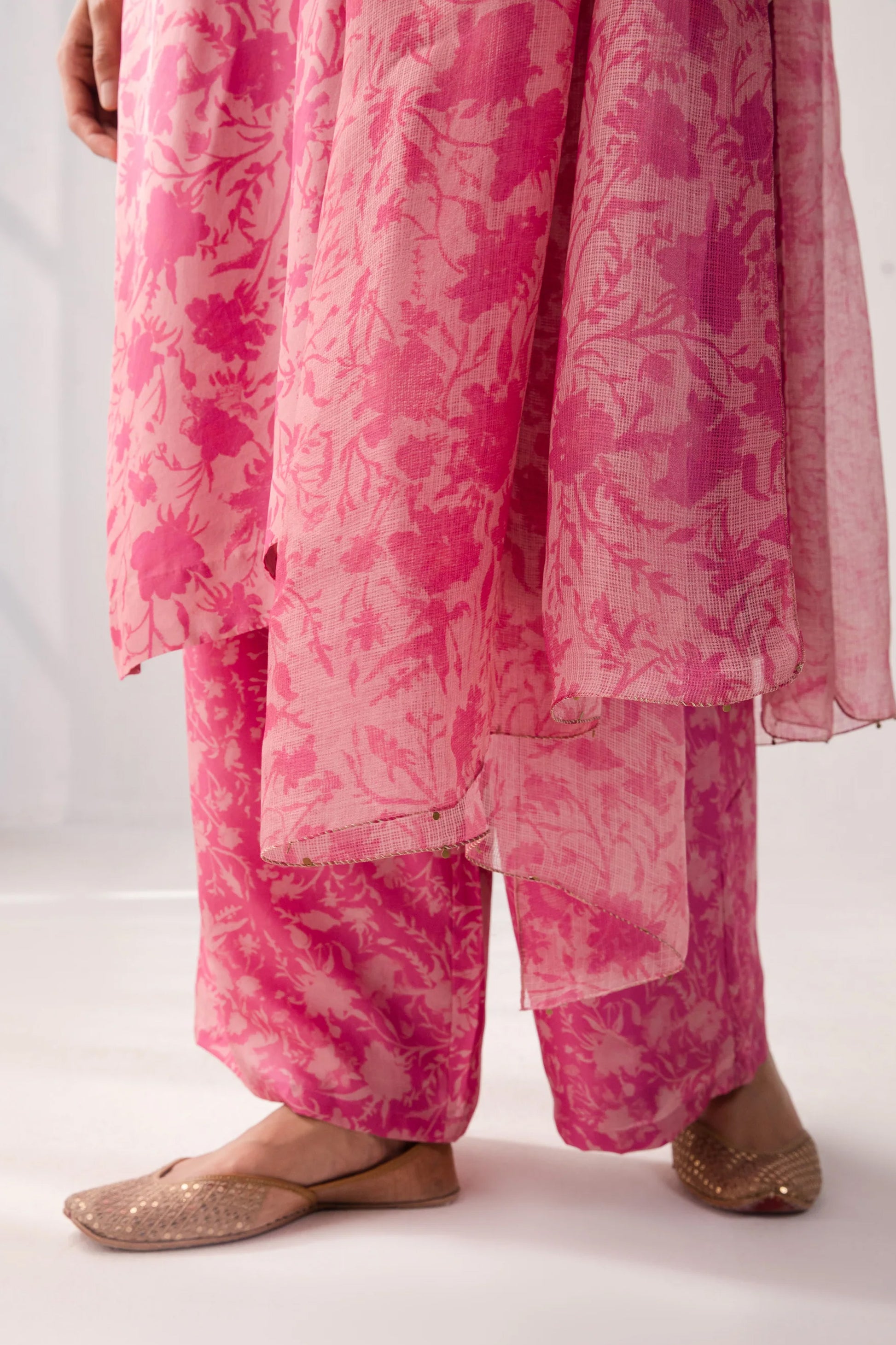 Printed silk kurta and silk pants paired with kota silk dupatta and fine mirror details on the yoke.