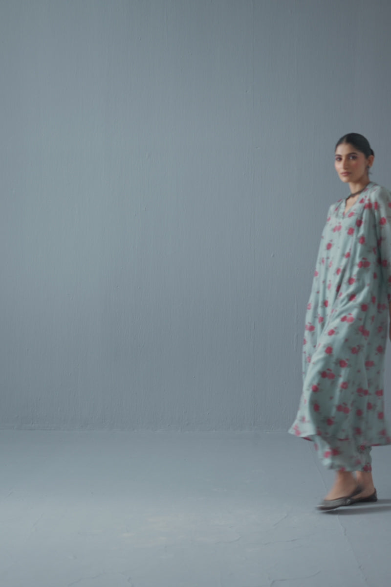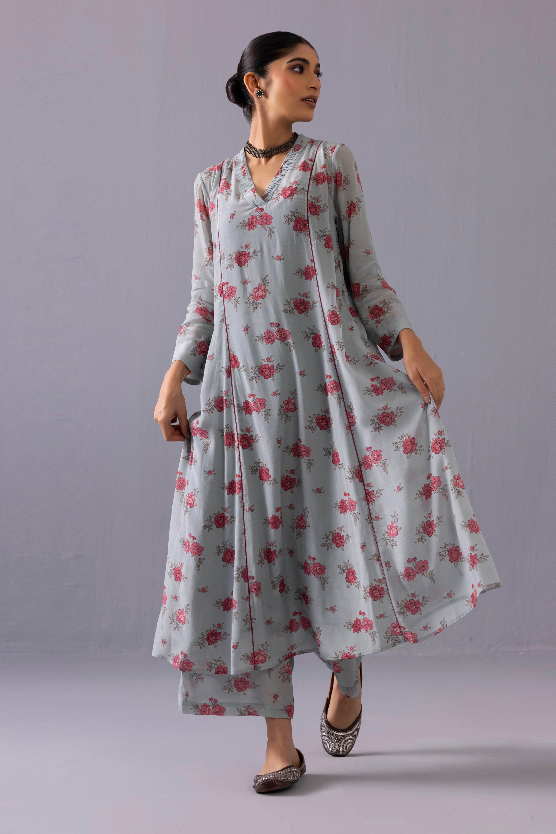 This elegant crepe kurta offers a beautiful flow and effortless drape, enhanced by a pleated neckline. Paired with matching palazzos, it’s a perfect blend of minimal elegance and contemporary charm—ideal for daytime events or festive gatherings.