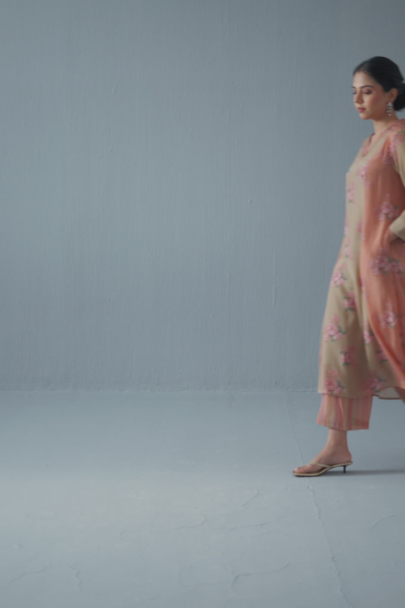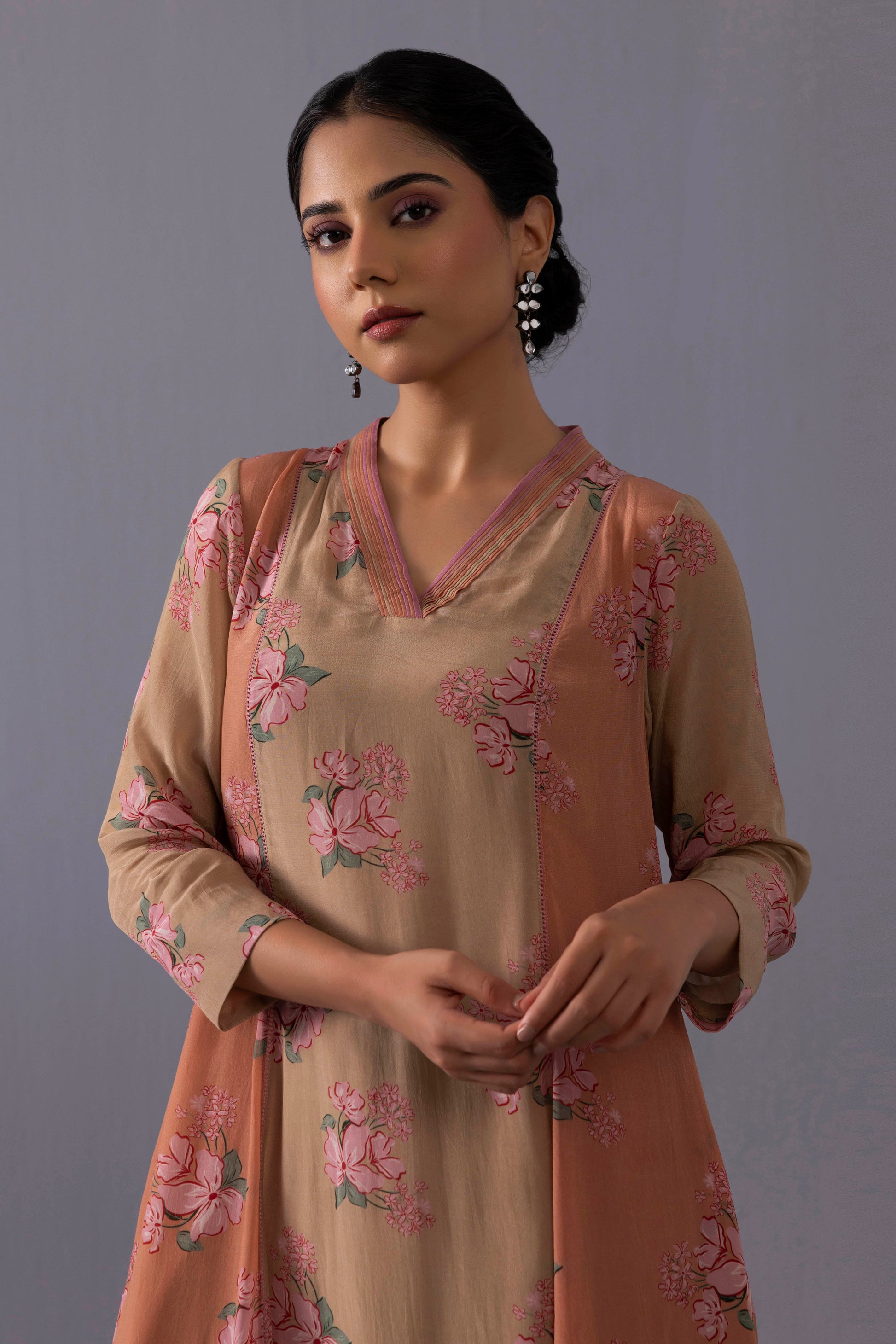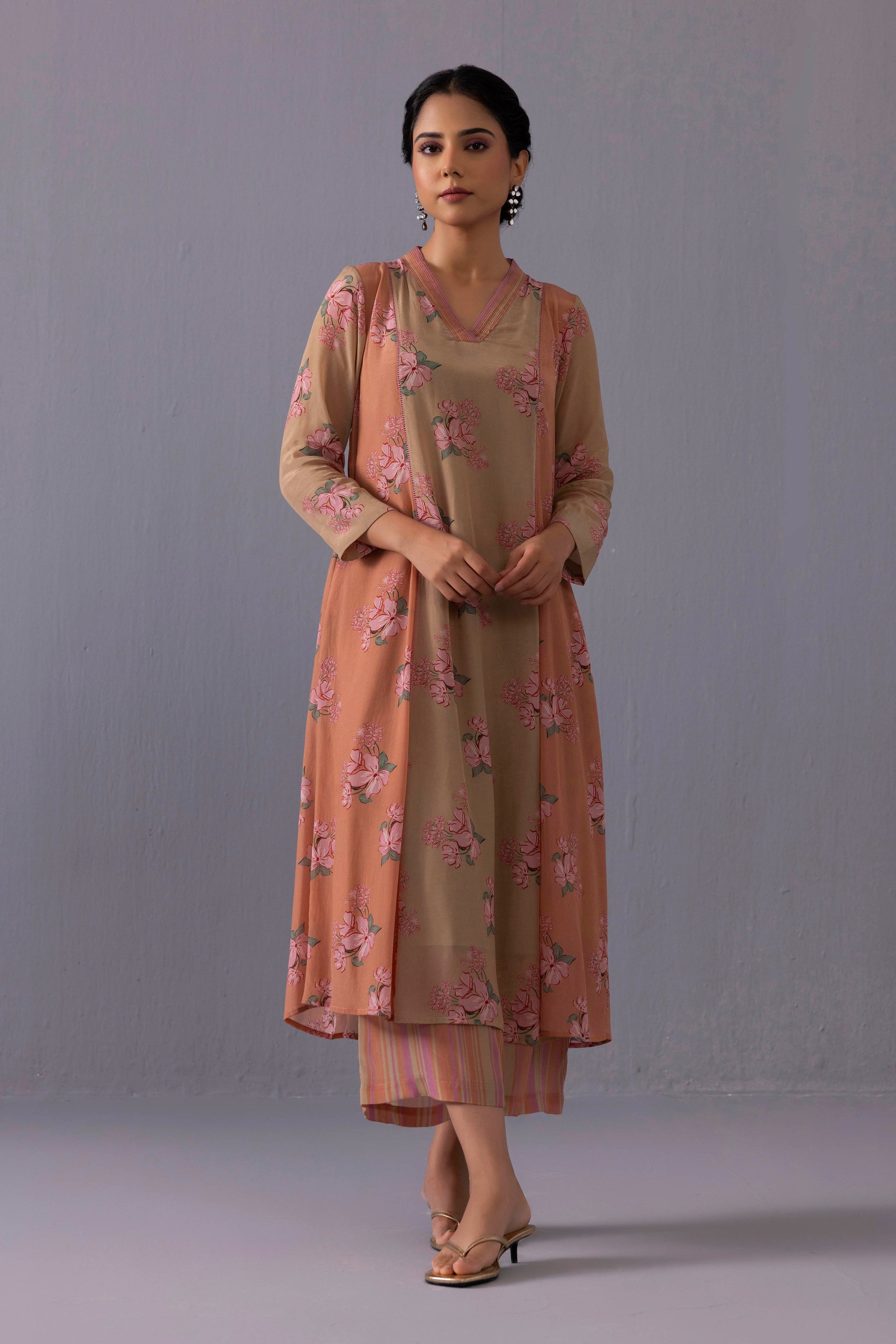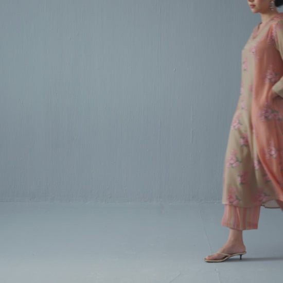 This elegant crepe kurta offers a beautiful flow and effortless drape, enhanced by a pleated neckline. Paired with matching palazzos, it’s a perfect blend of minimal elegance and contemporary charm—ideal for daytime events or festive gatherings.